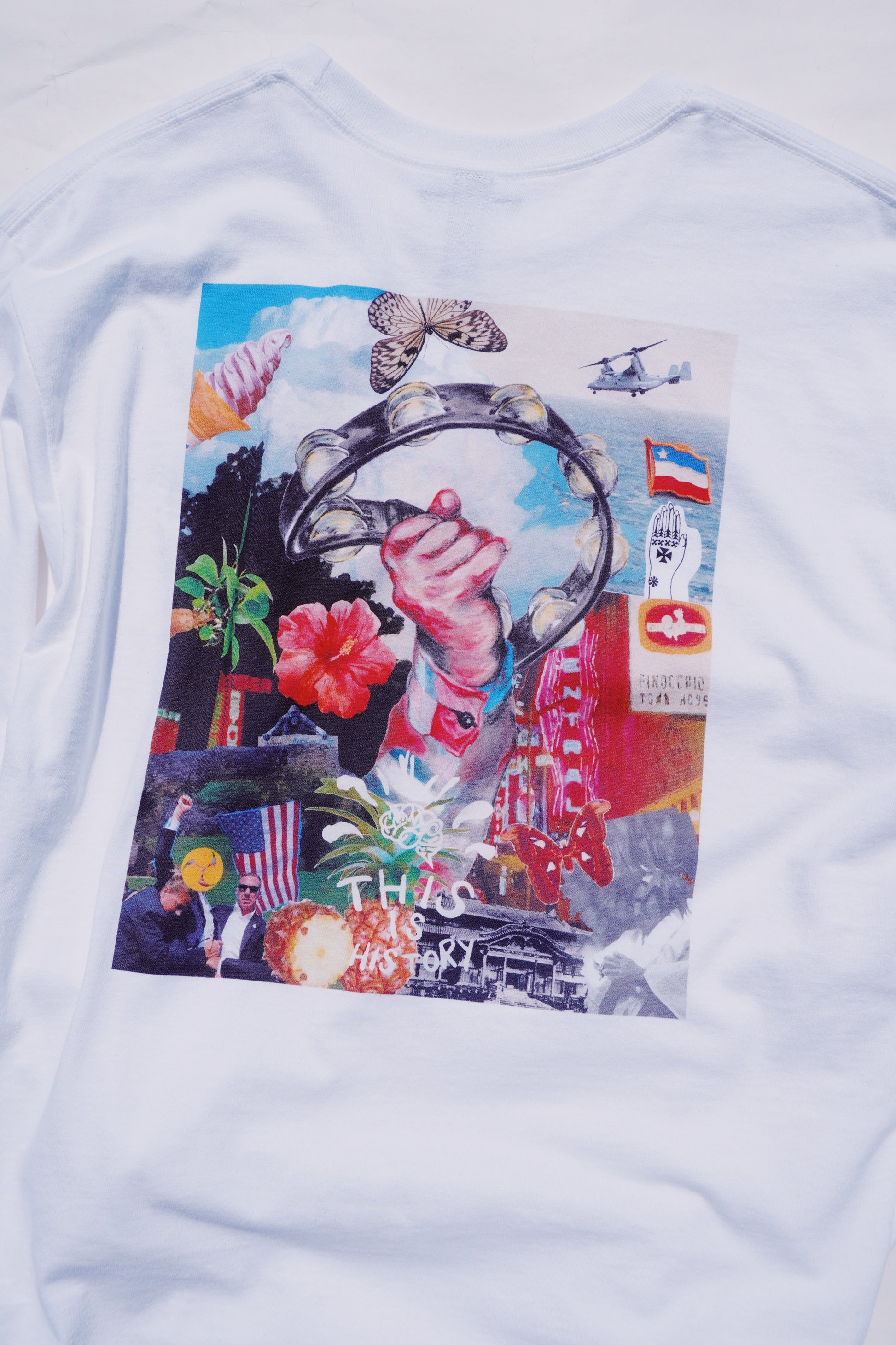 バックは96年の伝説のネブワーススタジアムLIVEで出た名言「THIS IS HISTORY(これは歴史なんだ)」をヒントに、琉球王朝時代の遺跡や首里城、1970年代のコザのネオン街。その他、沖縄を象徴するアイコンとリズムテック社のタンバリンのドローイングをコラージュしたアートワークを大胆にプリント。